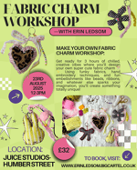 Get ready for 3 hours of chilled, creative vibes where you’ll design your own super cute fabric charm ✂️✨ Using funky fabrics, hand embroidery techniques, and fun embellishments like beads, ribbons, and whatever else sparks your imagination, you’ll create something totally unique!